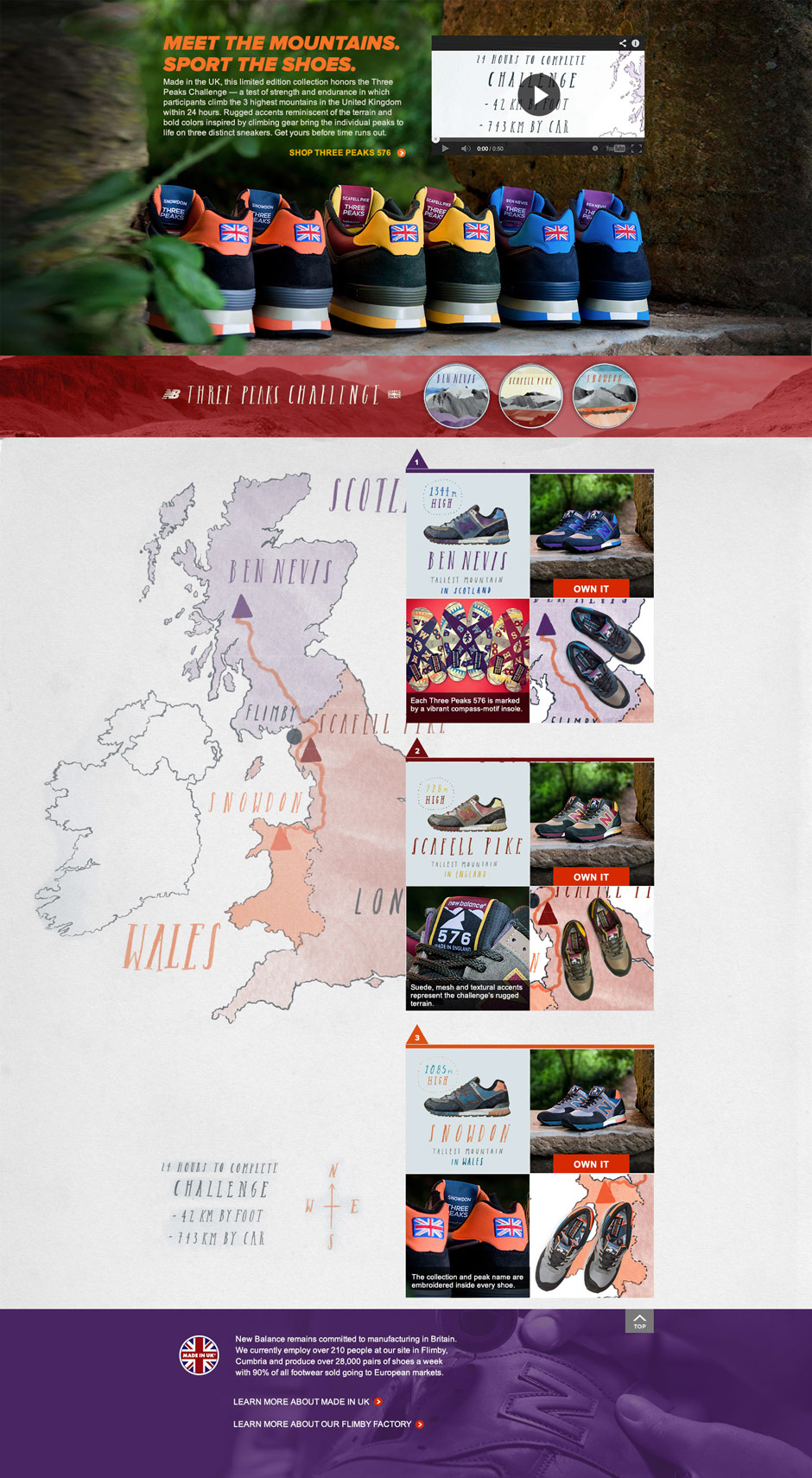 3 countries. 3 peaks. 24 hours. The Limited Edition Three Peaks 576 pays homage to the Three Peaks Challenge — in which participants climb the 3 highest mountains in the UK within 24 hours. These were a limited edition shoe which required a landing page to be designed and coded in 2 days. It featured a parallax map which lined up shoe info with the region/mountain on the map. These were also color coded to match the map and shoes together.